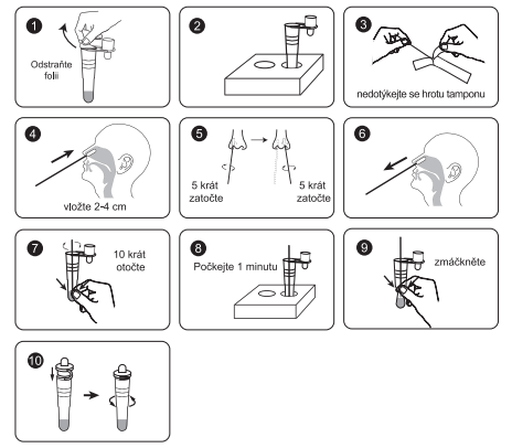 Správný postup: Odeberte výtěr, promíchejte ve zkumavce s pufrem, nasaďte kapátko a aplikujte 3 kapky do testovací kazety. Na výsledek vyčkejte 10 minut.