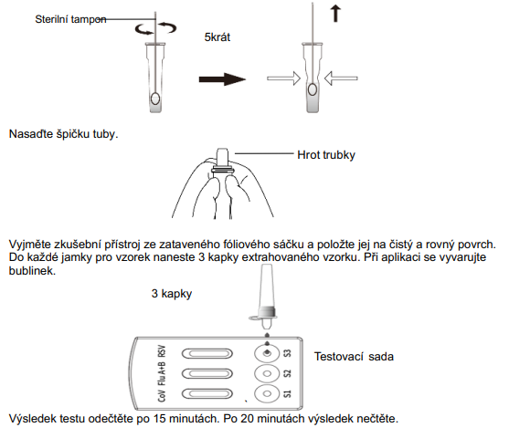 Použití je jednoduché: Odběr výtěru z nosohltanu, vložení do pufru, promíchání, nasazení kapátka a přidání 3 kapek do testovací kazety. Výsledek do 10 minut.