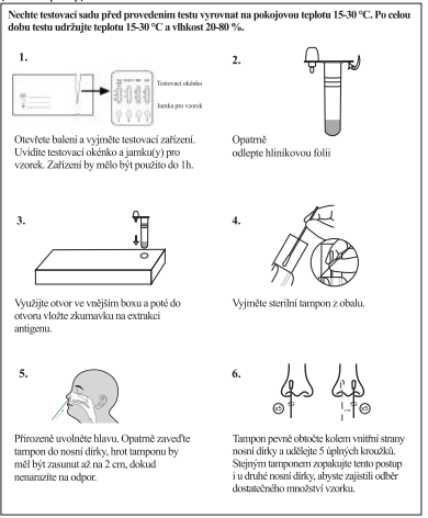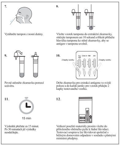 Správný postup: Odeberte výtěr z nosu, promíchejte vzorek ve zkumavce s pufrem, nasaďte kapátko a přidejte 3 kapky do každé testovací kazety. Na výsledek vyčkejte 10 minut.