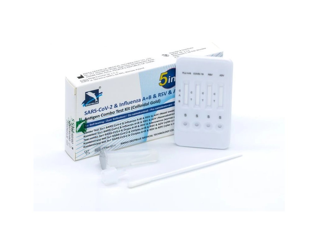 DeepBlue 5v1 domácí respirační test pro detekci SARS-CoV-2, chřipky A, B, RSV a adenoviru. Rychlý výsledek do 10 minut, přesný a pohodlný pro domácí samotestování – z jednoho vzorku.