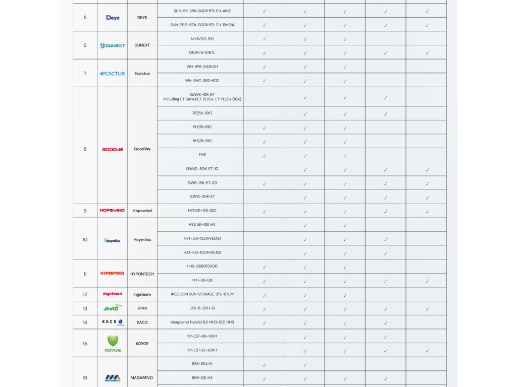 Dyness Tower S3 je kompatibilný s desiatkami popredných výrobcov hybridných striedačov, vrátane: