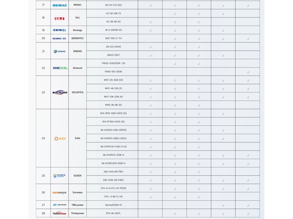 Solis, Senergy, SAJ, Solinteg, Sunways, TBB Power, Hopewind, Hoymiles