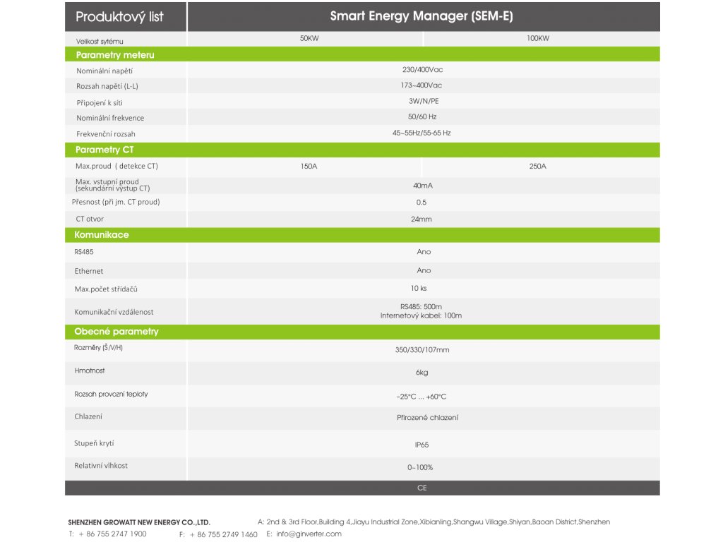 Growatt SEM-E (Smart Energy Manager) 50kW je navrhnutý pre monitorovanie spotreby a obmedzenia exportu energie v komerčných solárnych a akumulačných systémoch. Tento systém umožňuje sledovanie vlastnej spotreby a obmedzenia exportu energie do siete, čo je dôležité pre optimalizáciu využitia energie.