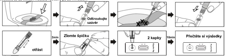 Použití je jednoduché: Pomocí odběrové tyčinky odeberte vzorek stolice, vložte do zkumavky s pufrem a důkladně promíchejte. Aplikujte 3 kapky do testovací kazety a odečtěte výsledek do 10 minut.