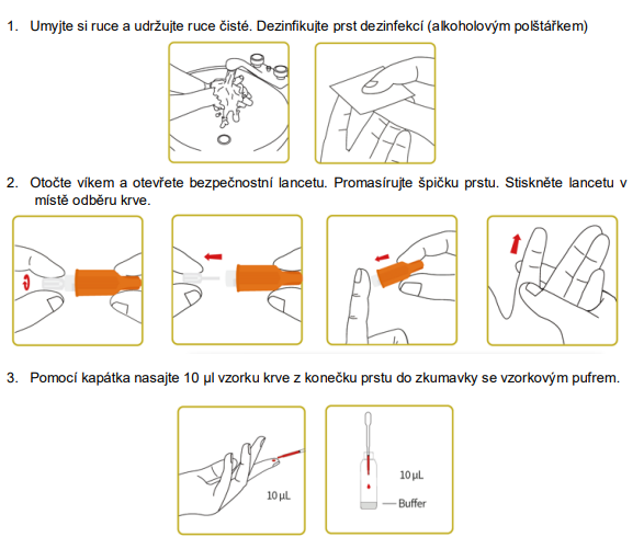 Použití je jednoduché: Odebírejte krevní vzorek z prstu, přeneste 5 µL do jamky S, přidejte 2 kapky pufru do jamky B, odečtěte výsledek po 15 minutách.