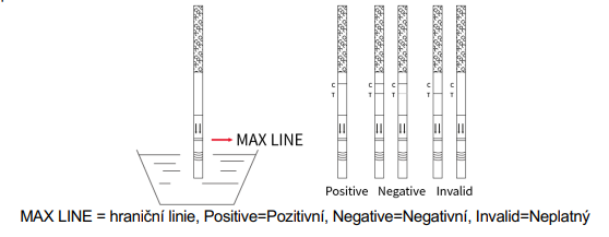 Použití je jednoduché: Ponořte testovací proužek do vzorku moči po označení MAX. Po 10–15 sekundách vyjměte a položte na rovnou plochu. Odečtěte výsledek po 5 minutách.