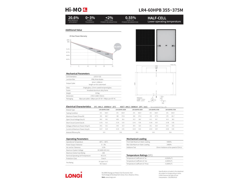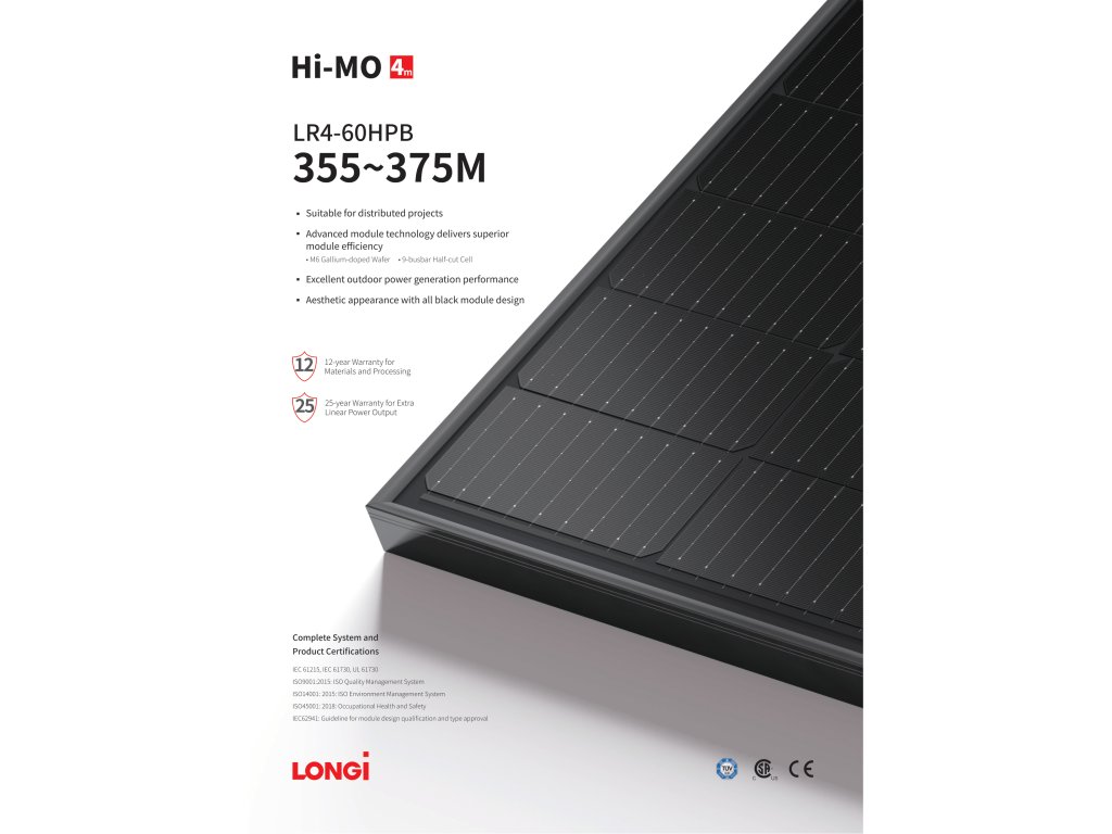Longi 375 Wp Hi-MO 4m LR4-60HPB-375M je vysoko výkonný solárny modul navrhnutý pre výnimočnú eleganciu a energetickú účinnosť. Tento model s maximálnym výkonom 375 Wp a pôsobivou účinnosťou modulu 20,6 % vyniká čisto čiernym dizajnom, ktorý dodá estetický vzhľad ku každej inštalácii. Jedná sa o monofaciálny modul s bielou zadnou doskou a čiernym eloxovaným rámom.