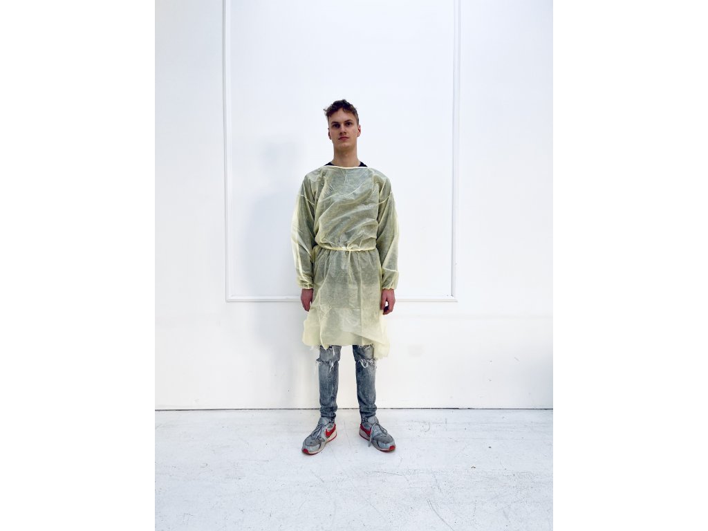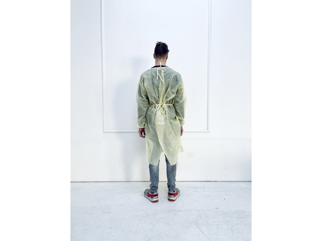 Jednorazová kombinéza zo 100 % netkanej textílie v žltej farbe, rukávy s gumou na koncoch, oblek so šnúrkami, materiál 25 g/m2.