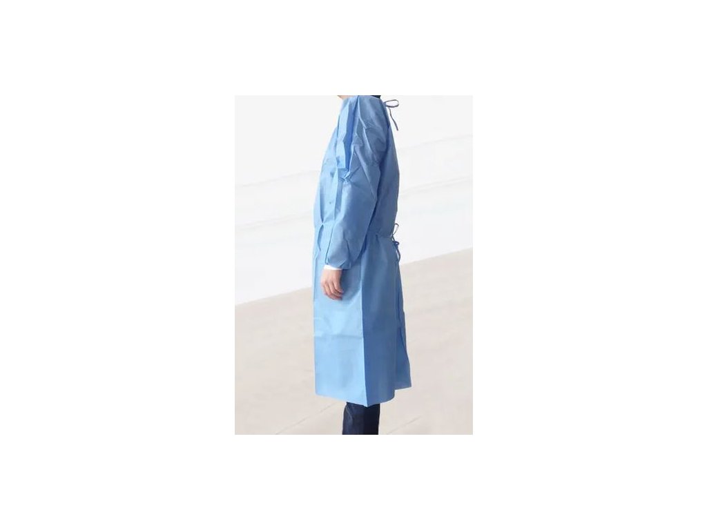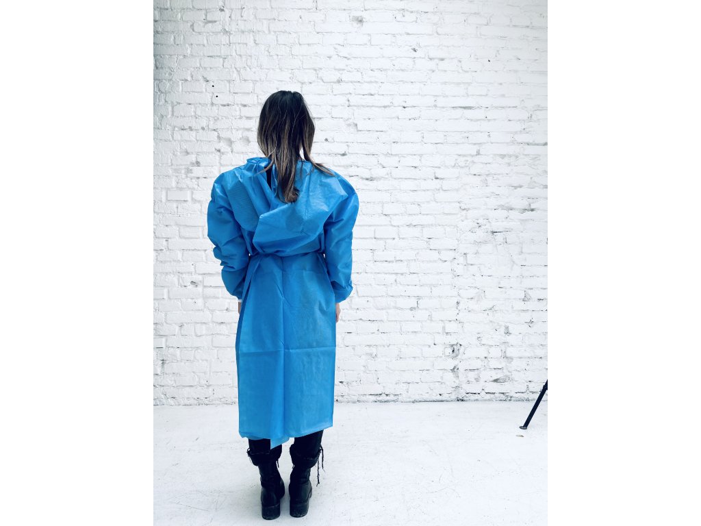 Jednorázový oblek ze 100% netkané textilie SMS v modré barvě, rukávy v koncích s rukávem, oblek se šňůrkami, materiál 40g/m2.