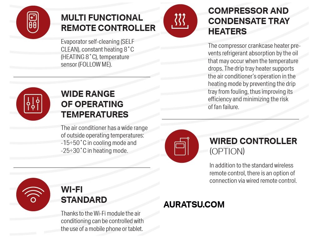 Auratsu znamená nielen špičkové materiály, nespočetné množstvo funkcií a inovatívne riešenia, ale aj všestranný a nadčasový dizajn, ktorý doplní každý interiér. Klimatizácie Auratsu sú určené pre domy, byty, malé kancelárie, prevádzky služieb, kaviarne a reštaurácie.