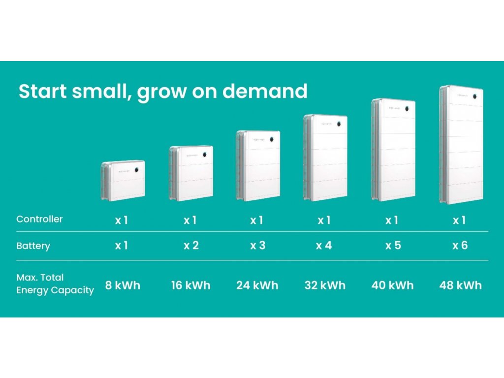 Tento systém na ukladanie solárnej energie v domácnostiach pojme minimálne jednu 5kWh sadu batérií a umožňuje stohovanie až šiestich 8kWh sád batérií, čo vedie k skladovacej kapacite až 48 kWh. Môžete začať s 5kWh alebo 8kWh úložiskom a podľa potreby ich pohodlne rozširovať obstaraním ďalších batériových modulov. Celý proces rozšírenia trvá iba 15 minút.
