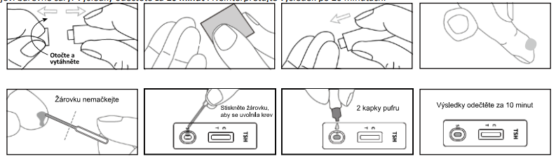 Použití je jednoduché: Proveďte dezinfekci prstu, použijte přiloženou lancetu, odeberte vzorek kapilárním kapátkem a naneste do jamky. Přidejte pufr, výsledek do 10 minut.