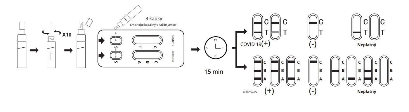 - Negativní výsledek u jednotlivého subjektu indikuje nepřítomnost detekovatelného COVID-19 nebo chřipkového antigenu A/B. Negativní výsledek testu však nevylučuje možnost expozice nebo infekce COVID-19 a chřipkou A/B.