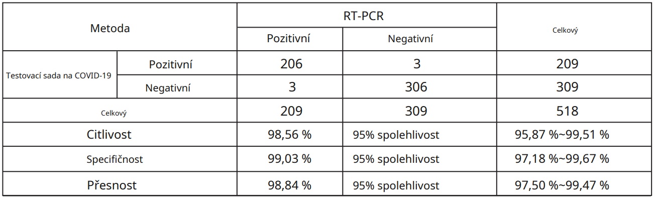 V této studii bylo testováno celkem 518 nazofaryngeálních vzorků. Klinické vzorky COVID-19 obsahují vzorky od jedinců s příznaky do 7 dnů. Výsledky testovaného činidla a kontrolního činidla byly 309 negativních vzorků a 209 pozitivních vzorků.