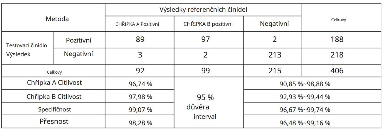 V této studii bylo testováno celkem 406 vzorků. Výsledky testovacího činidla a kontrolního činidla byly 215 negativních vzorků, 92 pozitivních vzorků na chřipku A a 99 pozitivních vzorků na chřipku B.