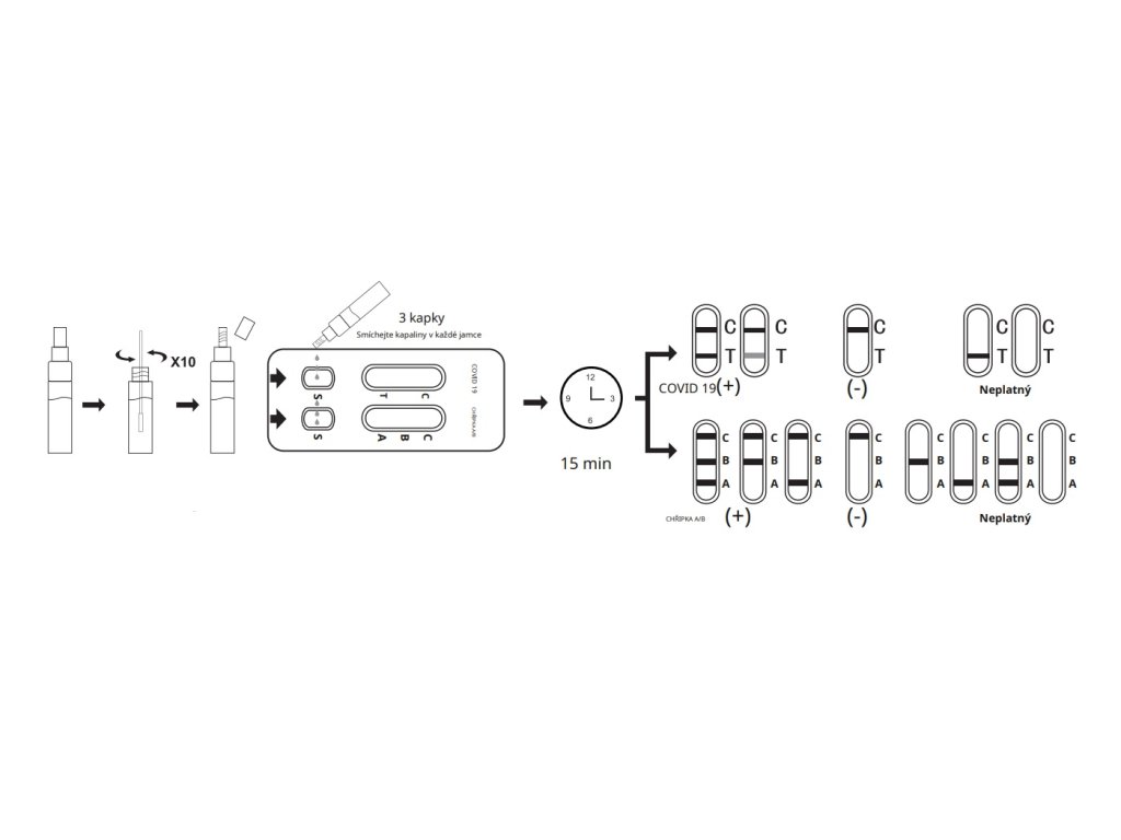 - Negativní výsledek u jednotlivého subjektu indikuje nepřítomnost detekovatelného COVID-19 nebo chřipkového antigenu A/B. Negativní výsledek testu však nevylučuje možnost expozice nebo infekce COVID-19 a chřipkou A/B.