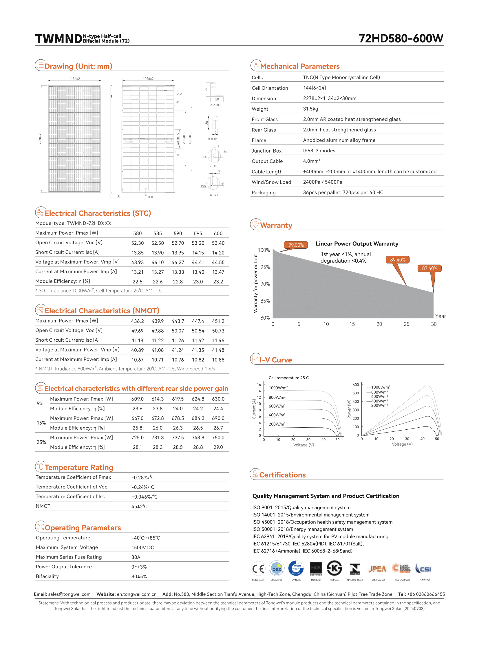 TW Solar 590 Wp Silver Frame Bifacial N-Type Half-cell 22,8% TWMND-72HD590